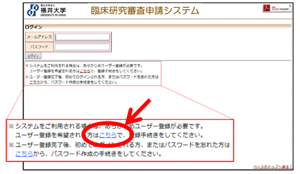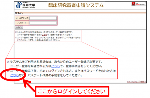 3. ログイン画面からユーザー登録希望者のログイン「こちら」をクリックしてユーザー登録の手続きを進めてください(登録するメールアドレスは「@u-fukui.ac.jp」に限りません)